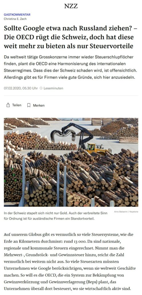 Im NZZ-Beitrag diskutiere ich 2020 die OECD-Kritik an der Schweiz und zeigt, warum das Land trotz steuerlicher Herausforderungen für Unternehmen attraktiv bleibt. Hier weiterlesen