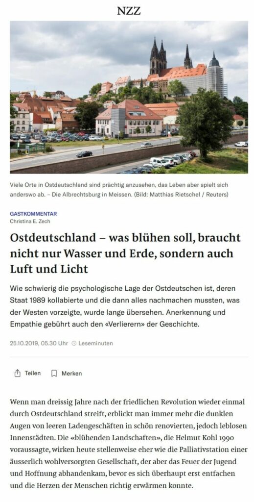 In der NZZ beleuchte ich 2019 die psychologische Lage Ostdeutschlands nach dem Mauerfall und plädiert für Anerkennung, Empathie und Verständnis für gesellschaftliche Herausforderungen. Hier weiterlesen